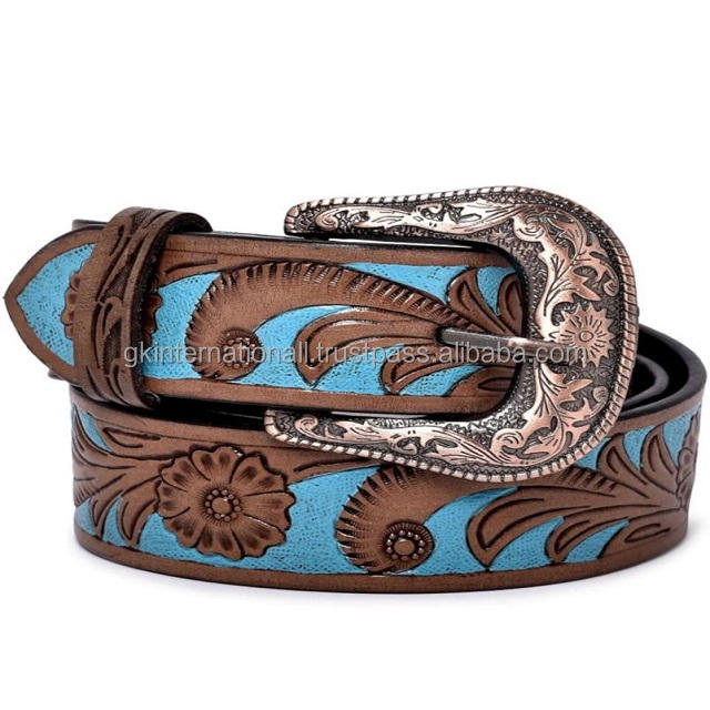 Cinturón de herramientas de cuero occidental grabado con hojas talladas a mano de diseño personalizado de alta calidad para unisex con hebilla de diseñador de acabado antiguo