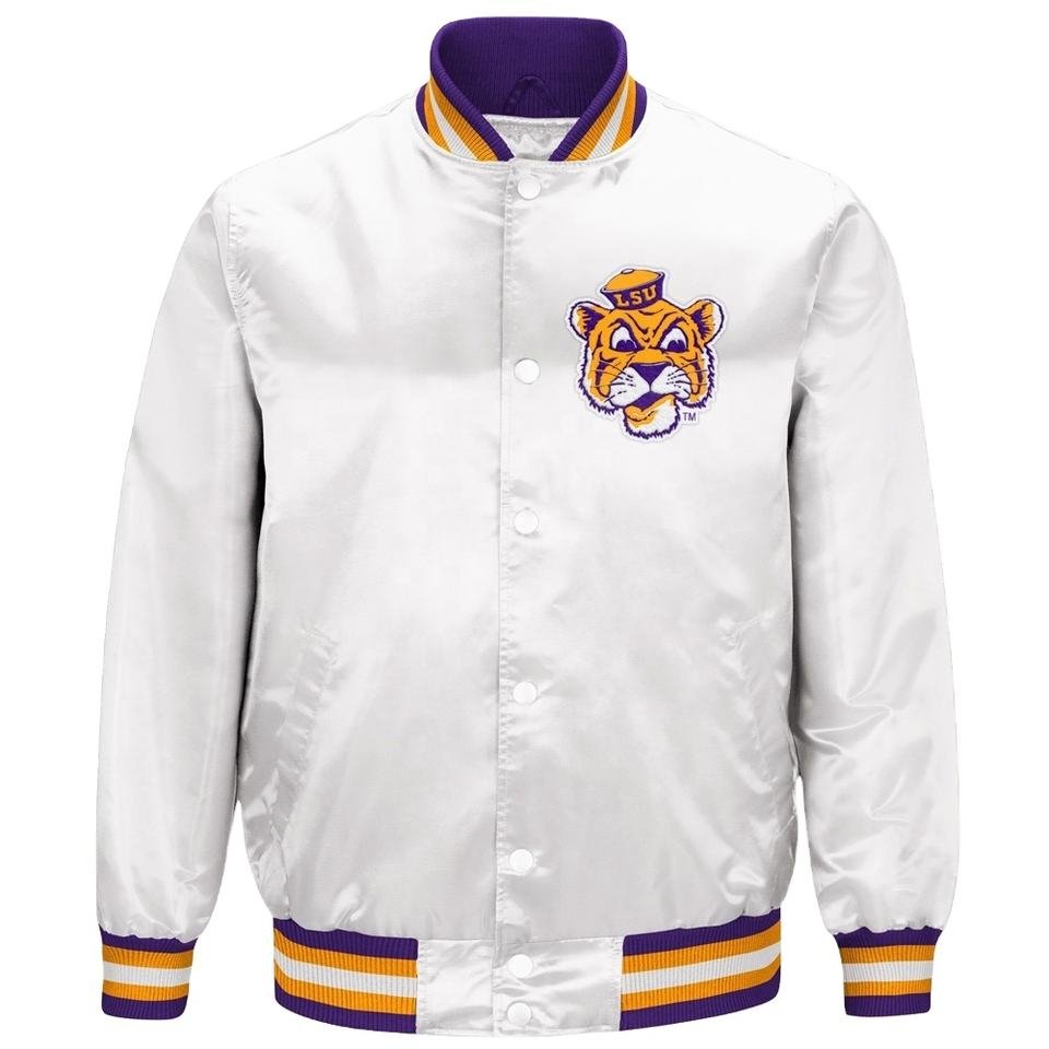 Chaqueta de béisbol universitaria de poliéster gruesa ecológica de diseño personalizado de alta calidad para hombre Vintage Satin Stand Collar Regular Fit