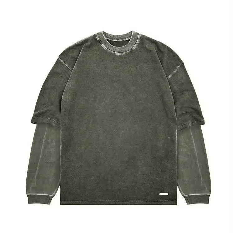 Camiseta de doble capa personalizada de alta calidad, manga larga lavada con ácido desteñida al sol, 100% algodón, camisetas para hombres al por mayor