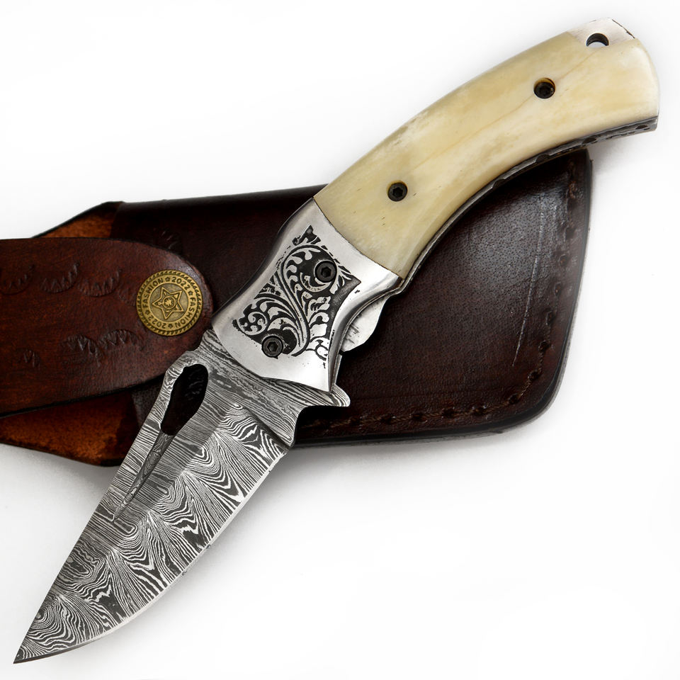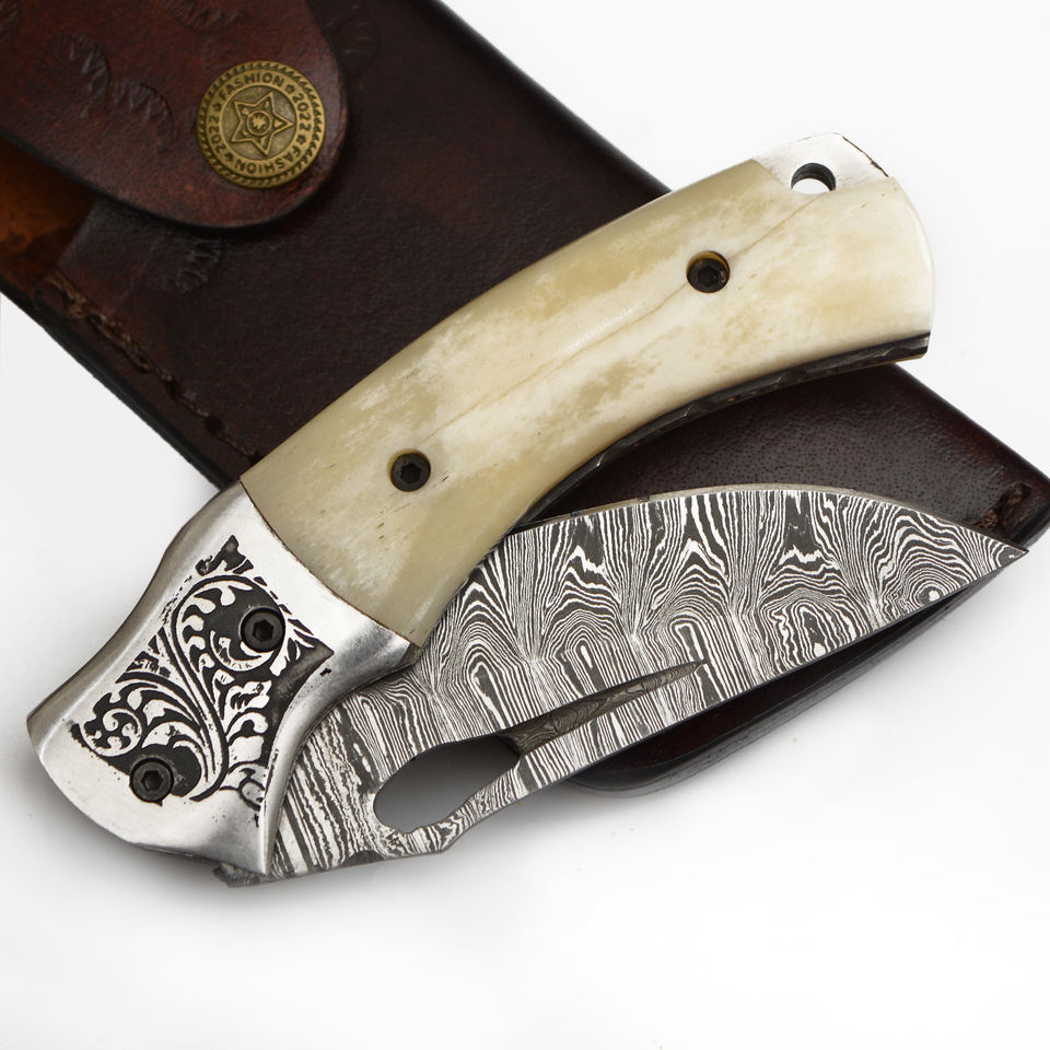 Cuchillo de acero de Damasco plegable personalizado de alta calidad con mango de hueso OEM compatible con caza cuchillos de bolsillo al aire libre Funda de cuero