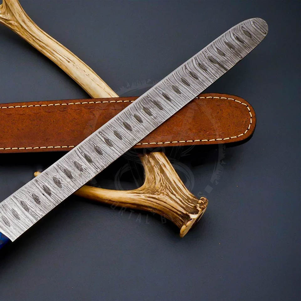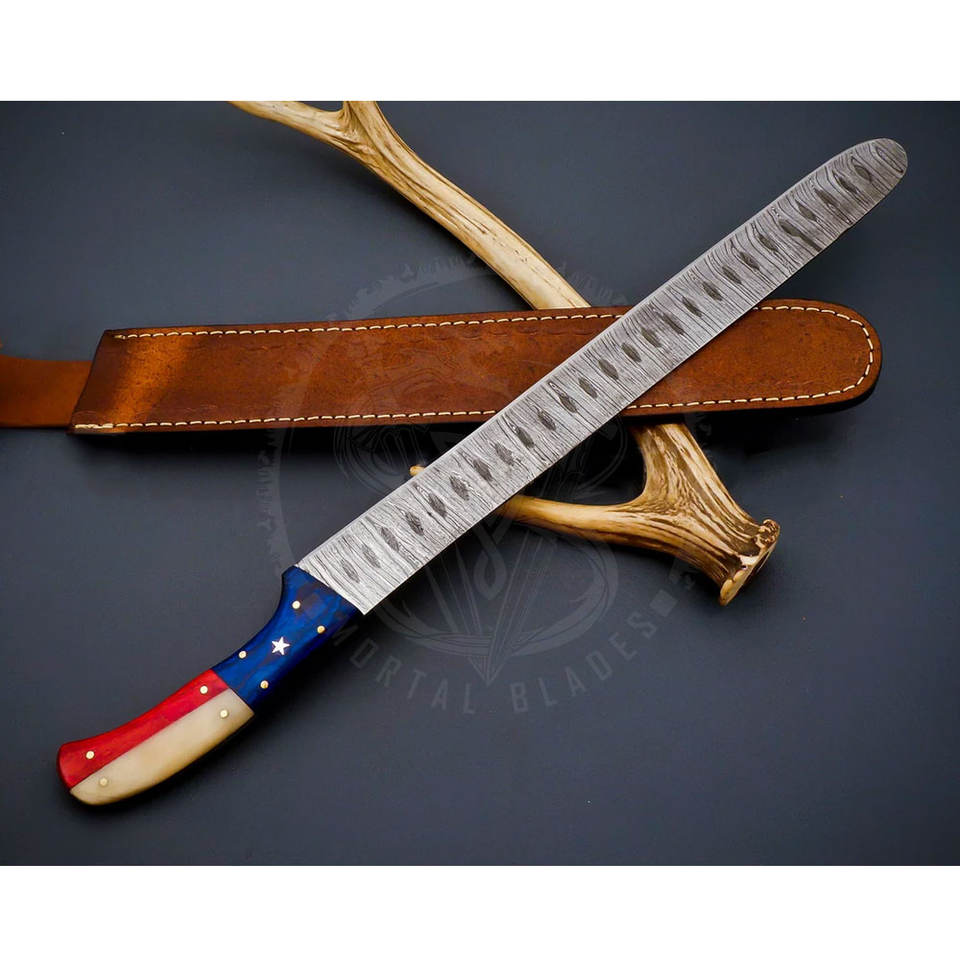 Cuchillo de bandera de Texas de acero de Damasco forjado a mano personalizado de alta calidad con mango de madera y Funda de cuero, cuchillo de pecho al por mayor