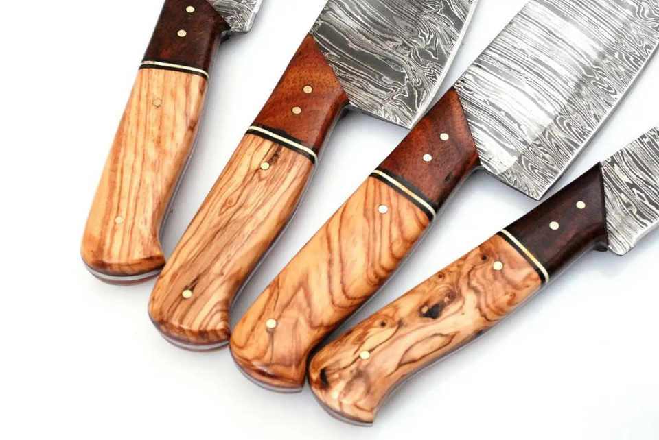Juego de cuchillos de Chef sostenibles de cinco piezas de acero al carbono hecho a mano personalizado de alta calidad, artesanía de acero, venta internacional de madera Pakka