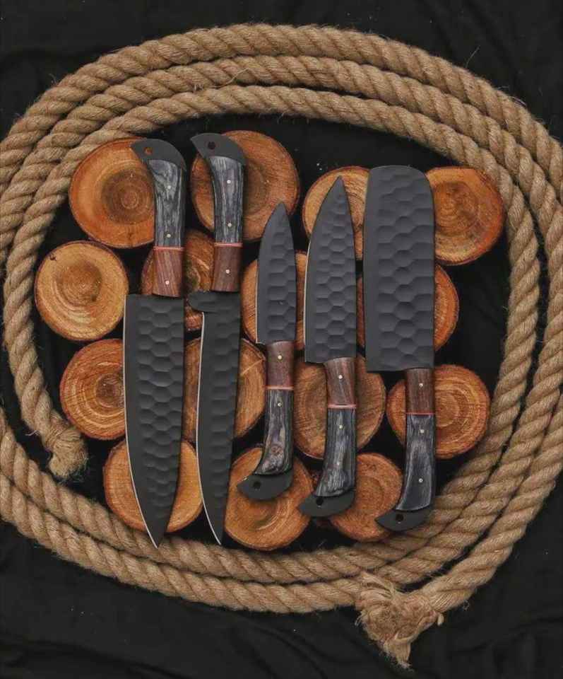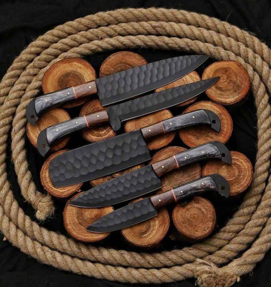 Juego de Cuchillos de Chef de Acero con Alto Contenido de Carbono Hechos a Mano de Alta Calidad con Mangos de Hueso, Juego de 5 Piezas con Funda de Cuero, Recubrimiento Negro