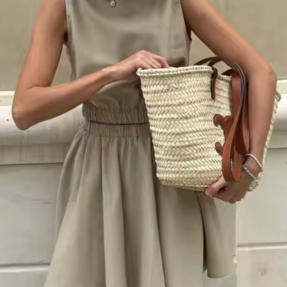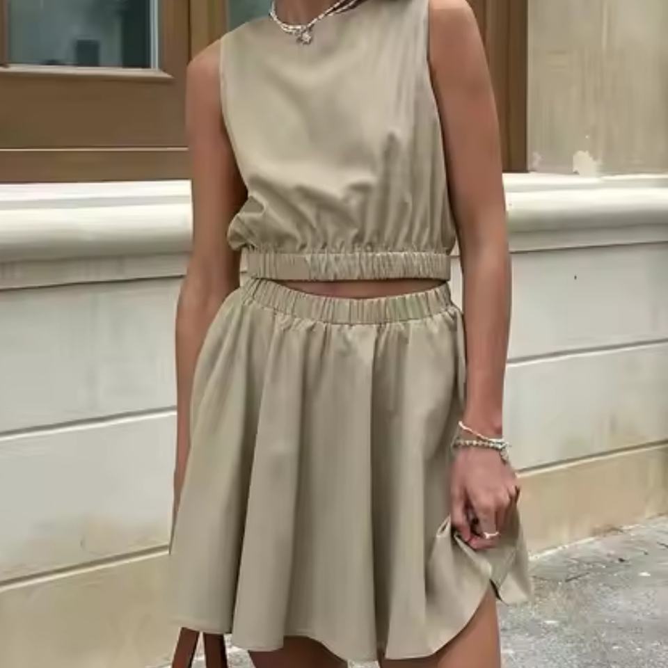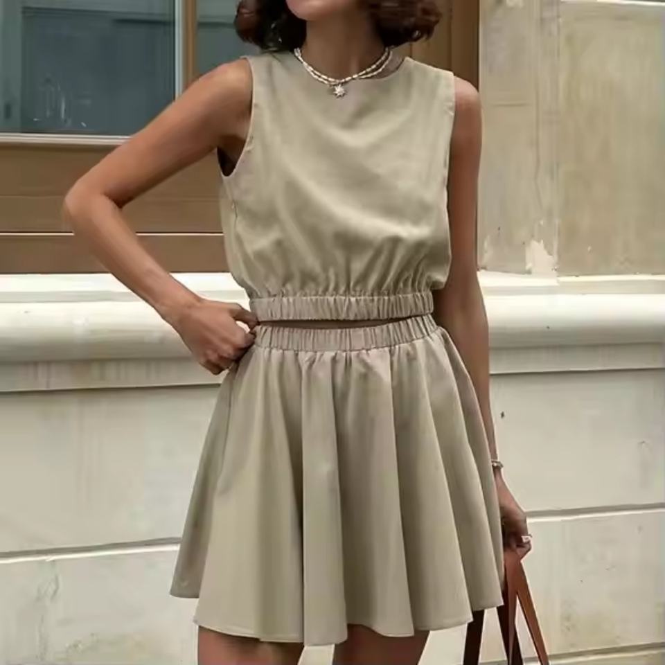 Conjunto de Ropa de Lino Informal con Logotipo Personalizado de Alta Calidad, Top Corto sin Mangas y Falda Plisada de Lino para Mujer