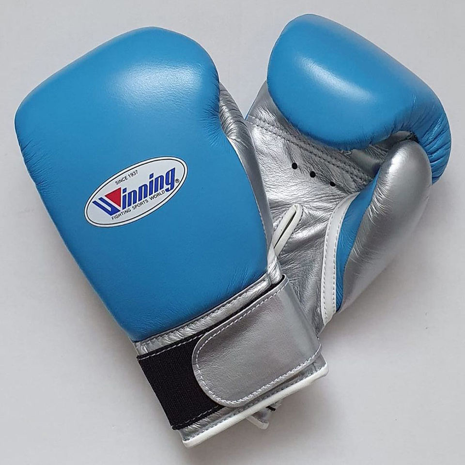 Guantes de boxeo hechos a medida de alta calidad Guantes de boxeo con correa de color azul claro y plateado metálico 2017