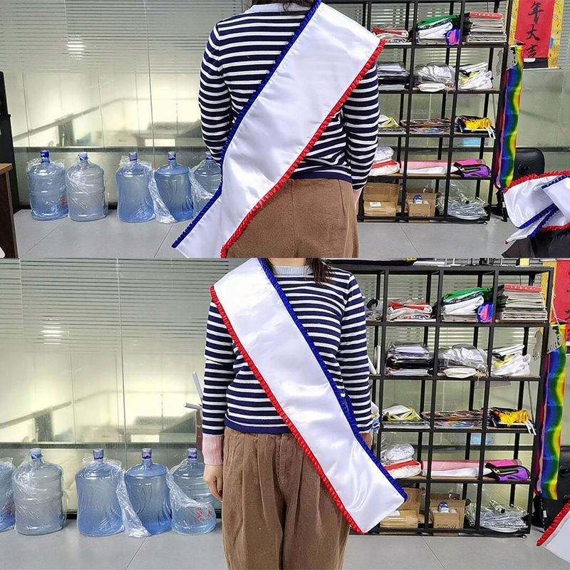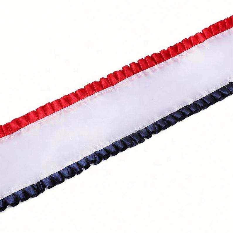 Banda Publicitaria de Verano Miss Americana de Poliéster Personalizada de Alta Calidad con Estampado por Sublimación y Volantes Rojos y Azules
