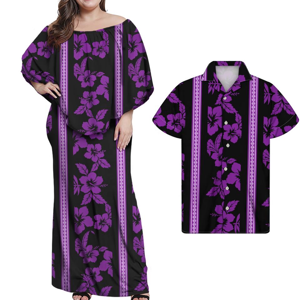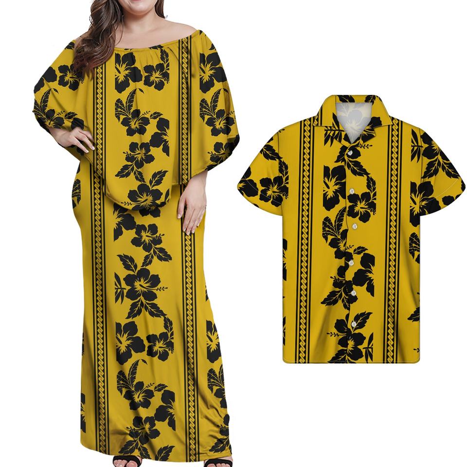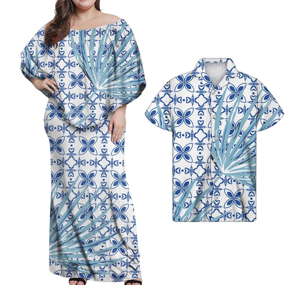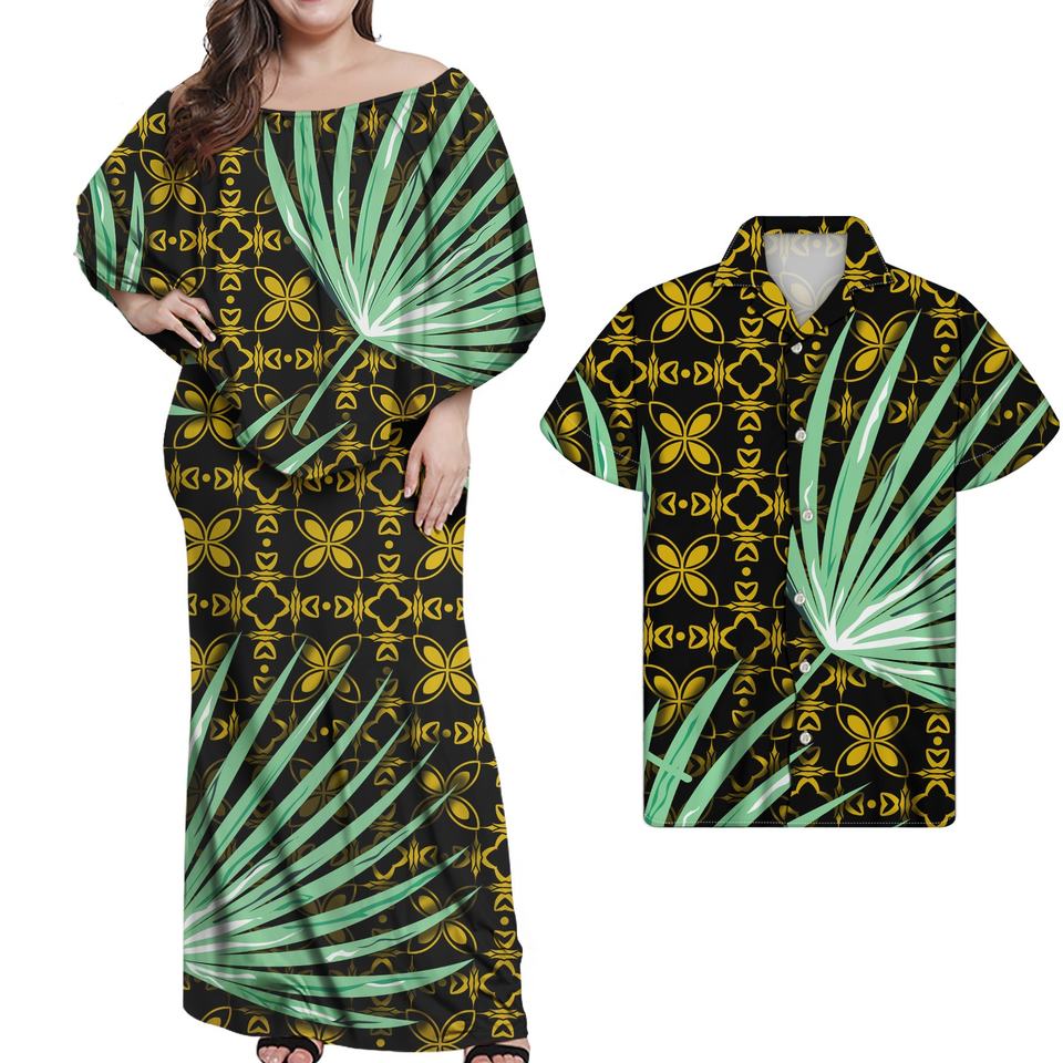 Alta calidad personalizada Samoan Green Leaf Print mujeres fuera del hombro Poncho largo vestido Hawaiano Retro Match Plus Size camisa de hombre