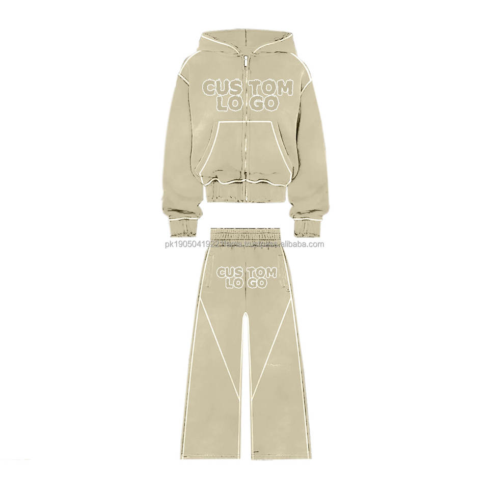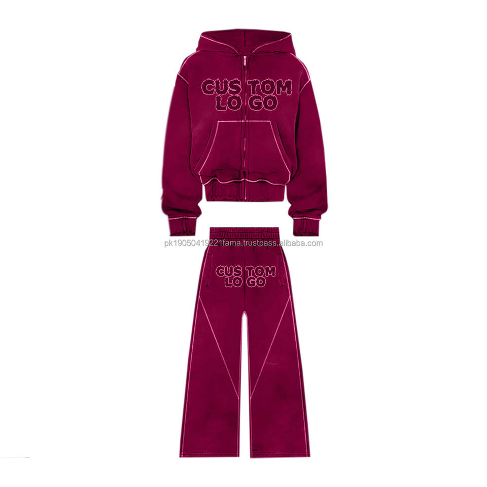 Pantalones de chándal personalizados de alta calidad, chándal con lavado ácido, diamantes de imitación, cremallera, Sudadera con capucha y pantalones de chándal acampanados, conjunto de chándal