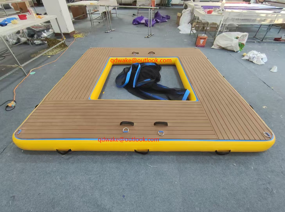 Pontón inflable de grano de madera personalizado de alta calidad, plataforma flotante, balsa de isla para Estación de moto de agua, muelle de yate, uso de natación