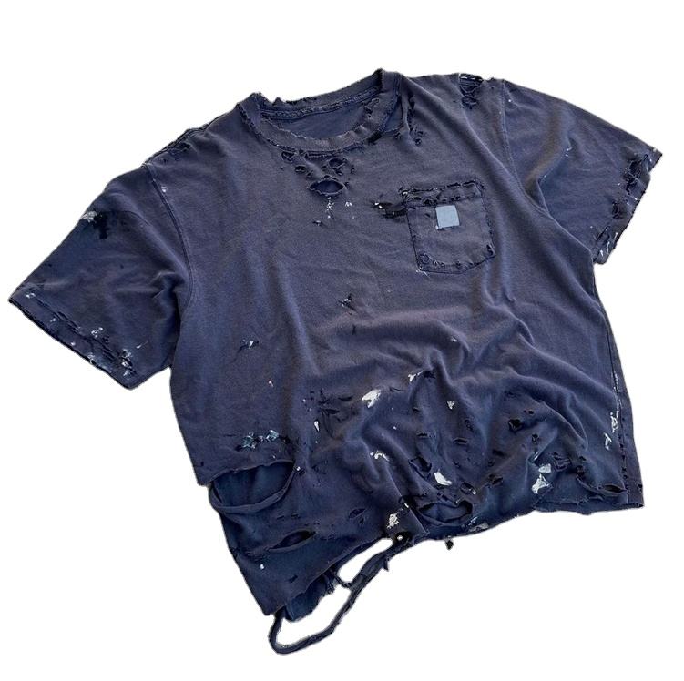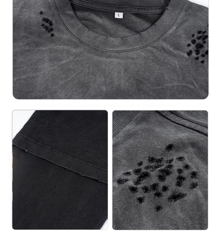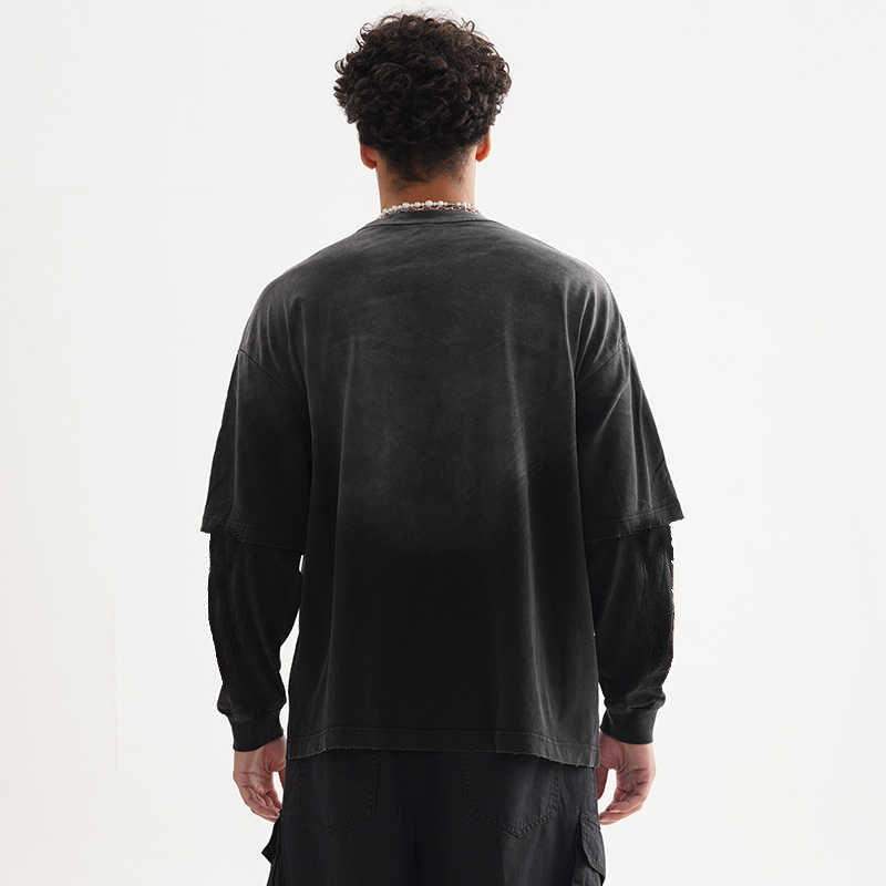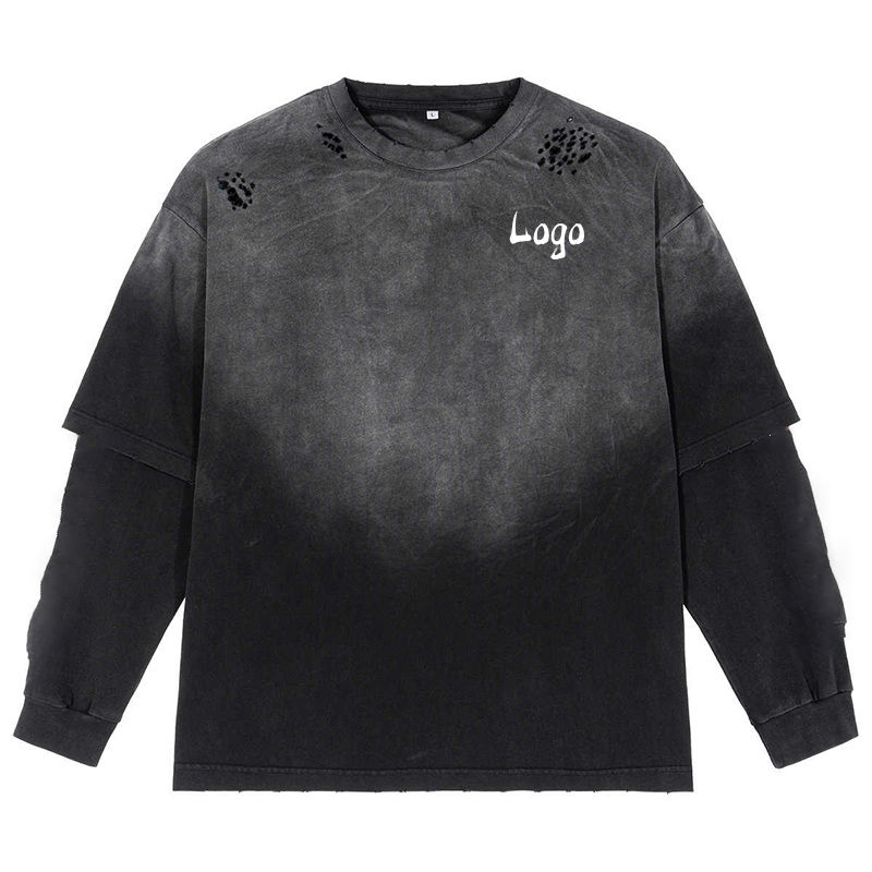 Camisetas de logotipo de diseño personalizado de alta calidad, camiseta de manga larga de doble capa con lavado ácido de piedra desgastada rasgada Vintage para hombres