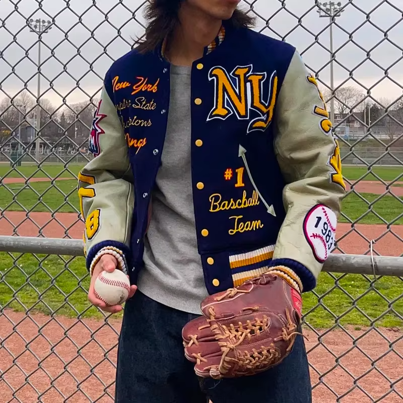 Chaquetas de béisbol vintage personalizadas de alta calidad ODM OEM para hombre Letterman Varsity con diseño de parche bordado de chenilla personalizado