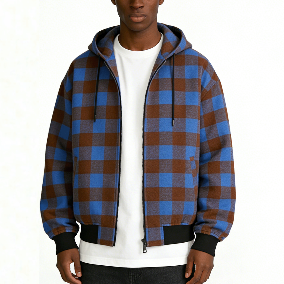 Sudadera con Capucha de Diseñador de Alta Calidad, Patrón a Cuadros Personalizado, Sudadera Reversible con Cierre, Hombros Caídos, Sudadera Extra Grande para Hombre