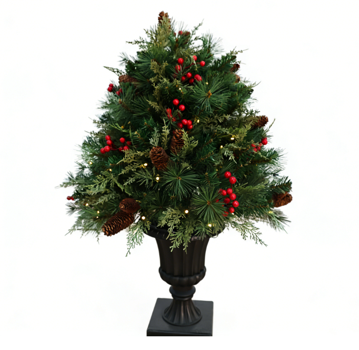 Árbol de Navidad Artificial Preiluminado de Alta Calidad, Ecológico, de PE+PVC, de 1.2 m, con Bayas Rojas, Piñas Decorativas y Base de Tela para las Fiestas