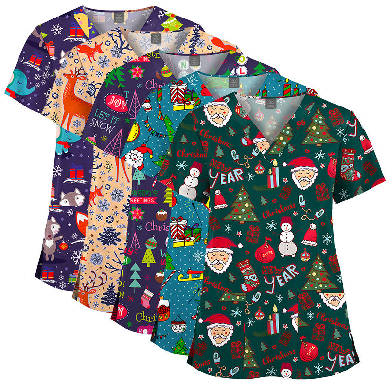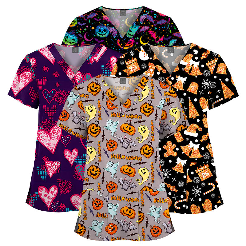 Alta calidad elástico moda estilo logotipo personalizado Hospital uniformes médico enfermera uniforme Unisex dibujos animados impreso Scrub Top