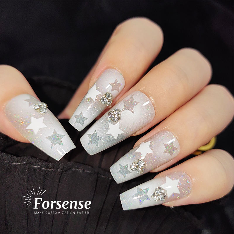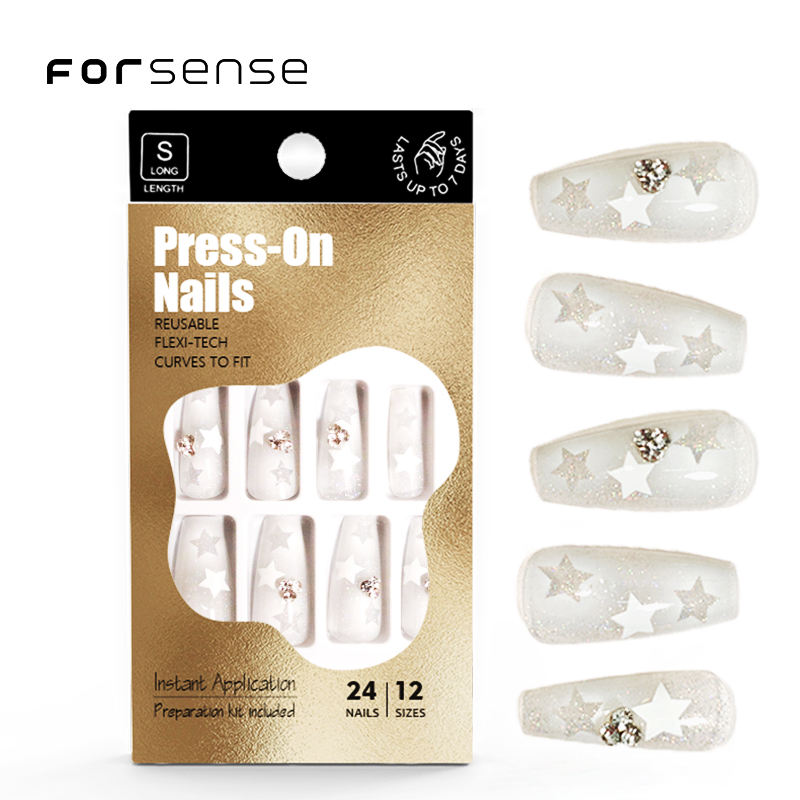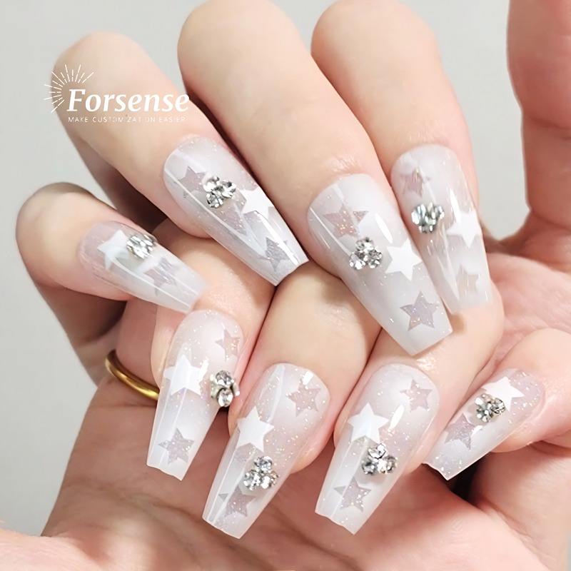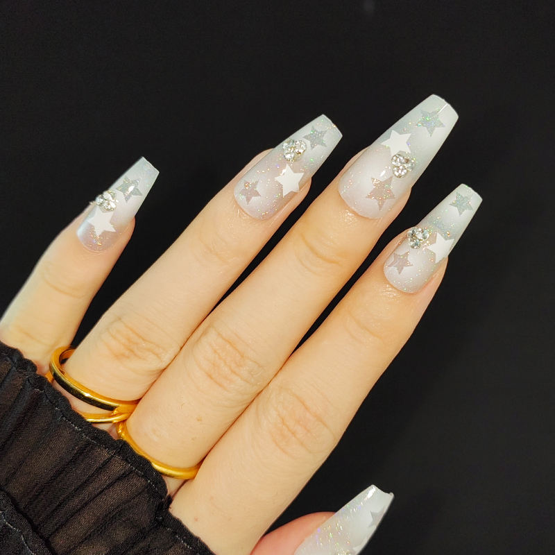 Uñas postizas elegantes de alta calidad, diseño personalizado, prensa en las uñas con dijes, ataúd corto de diamante, estrella blanca, uñas postizas ostentosas brumosas