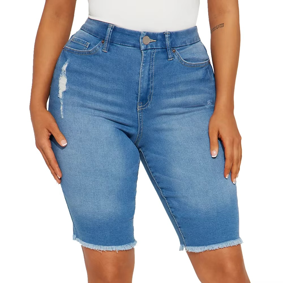 Pantalones cortos de mezclilla de tiro alto para mujer a la moda de alta calidad para mujer al por mayor nuevos pantalones cortos de mezclilla ajustados con dobladillo crudo para mujer Color azul
