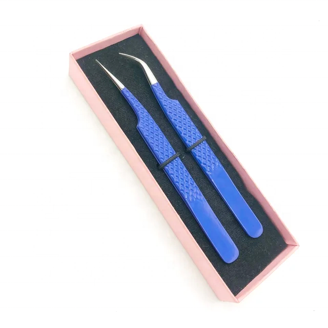Pinzas para pestañas con punta de fibra de alta calidad, producto más vendido, pinzas curvas recubiertas de polvo azul, pinzas de aislamiento