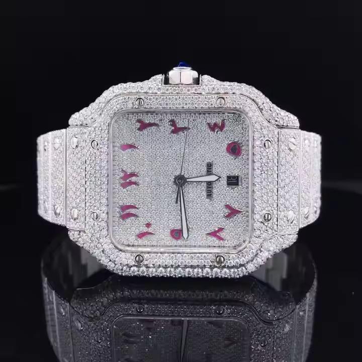 Reloj de diamantes de moissanita personalizado completamente helado de alta calidad, esfera analógica mecánica de lujo con número arábigo, encanto de Hip Hop