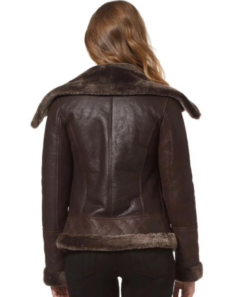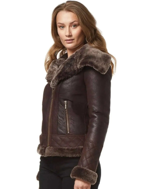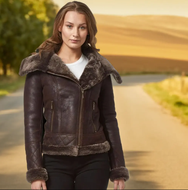 Chaqueta de Motociclista de Cuero Genuino de Alta Calidad para Mujer, Estilo Personalizado, Color Marrón, con Forro de Borrego y Dos Bolsillos con Cremallera