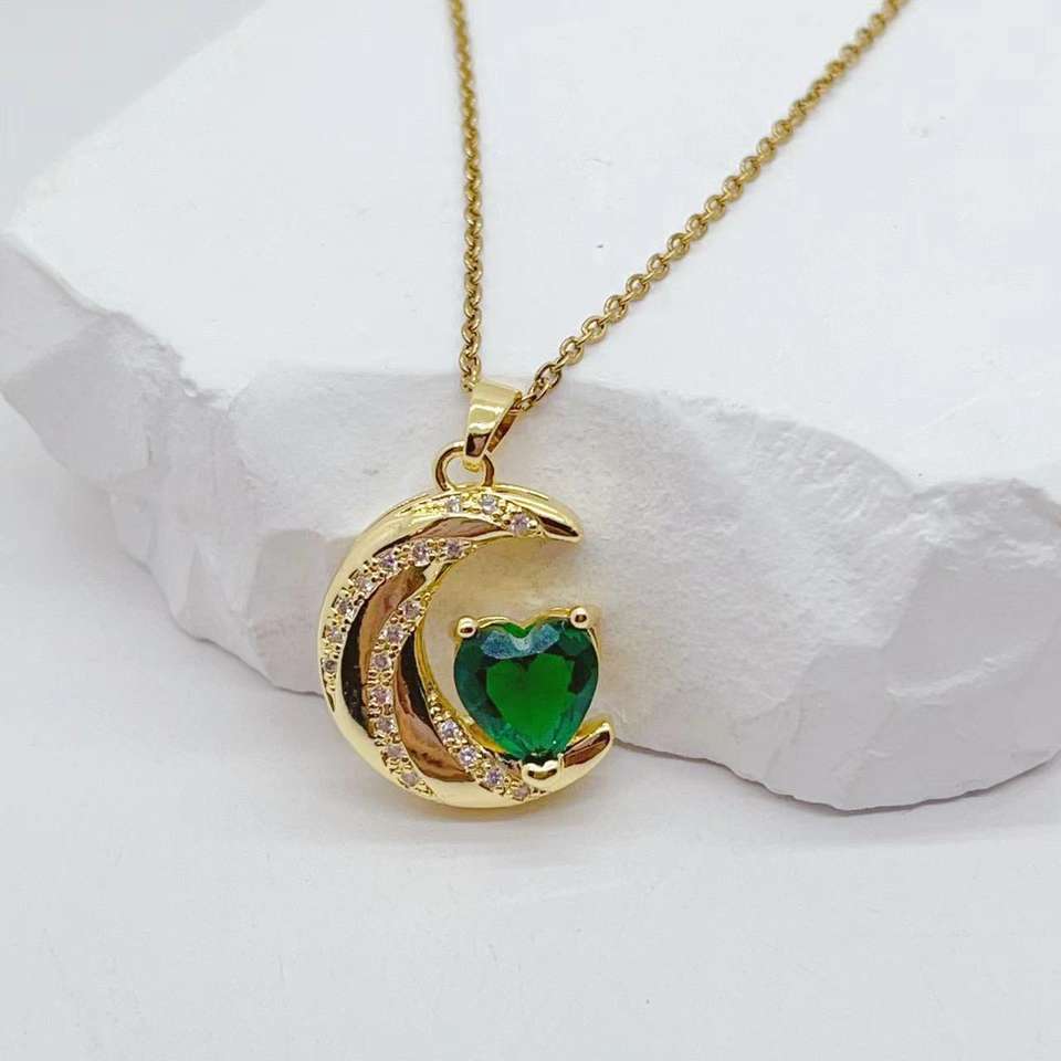 Collar de luna creciente CZ chapado en oro de alta calidad, joyería, collar con colgante de luna de circón de corazón colorido para mujer