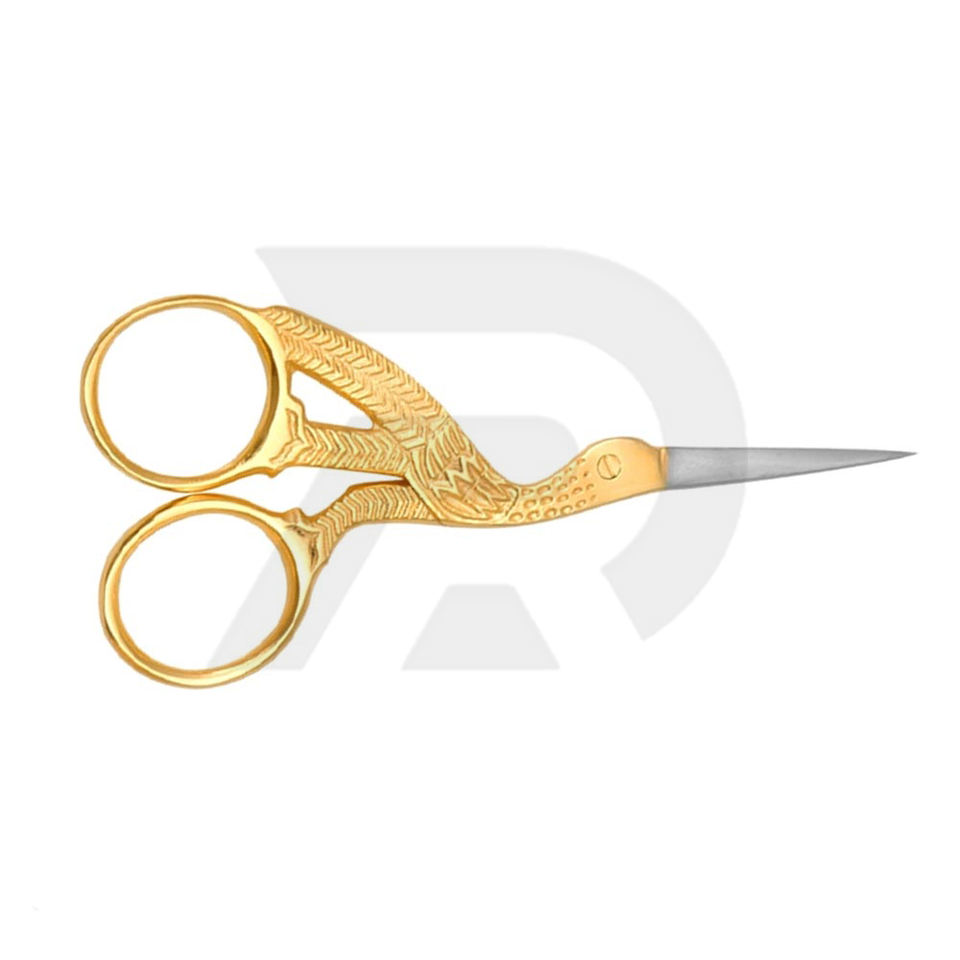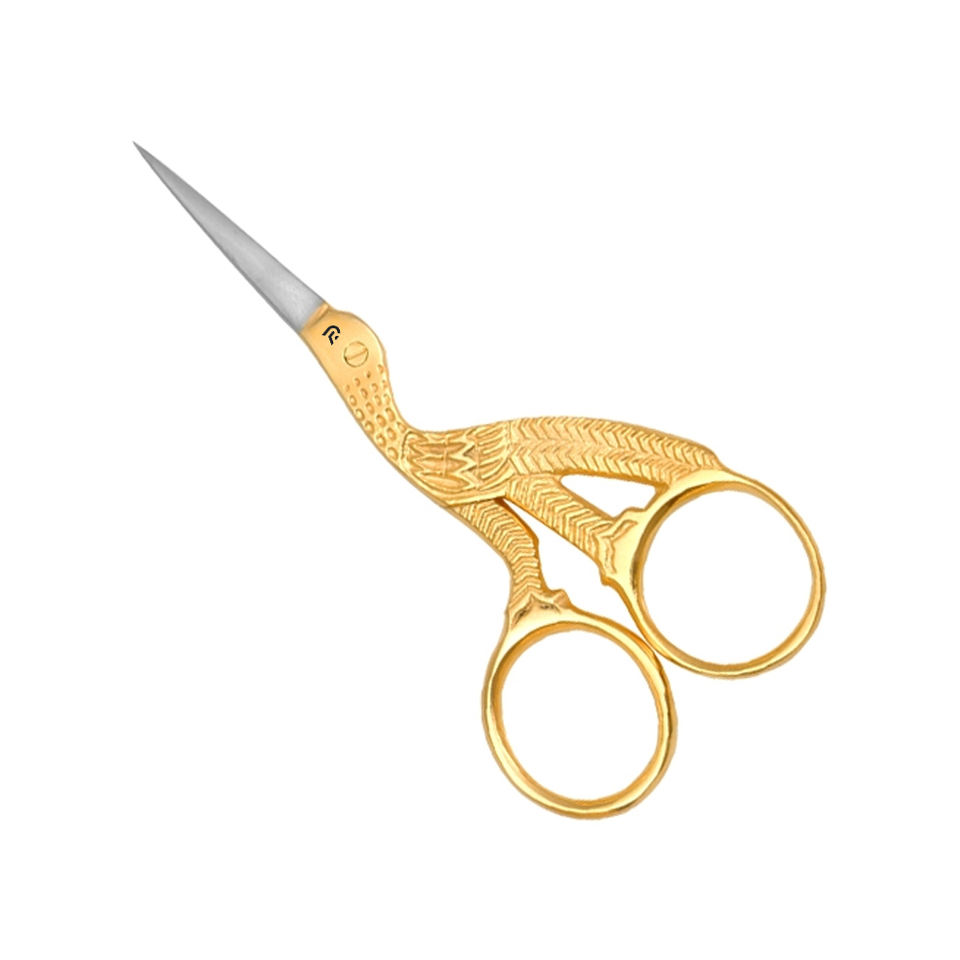 Tijeras de cigüeña de acero inoxidable chapadas en oro de alta calidad para dar forma a las cejas, corte de borde suave, hermoso bordado al por mayor