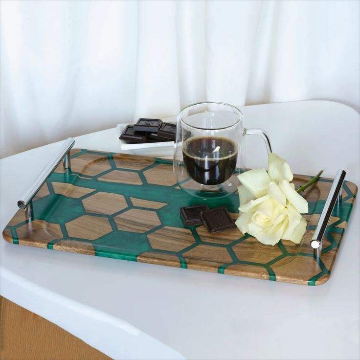 Bandeja de Servicio de Madera y Resina Epoxi de Grado Comercial, Hecha a Mano, Ecológica y de Alta Calidad, con Asa de Metal, Apta para Lavavajillas, para Restaurantes