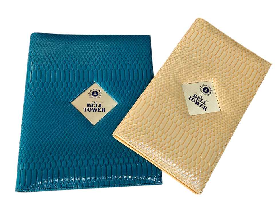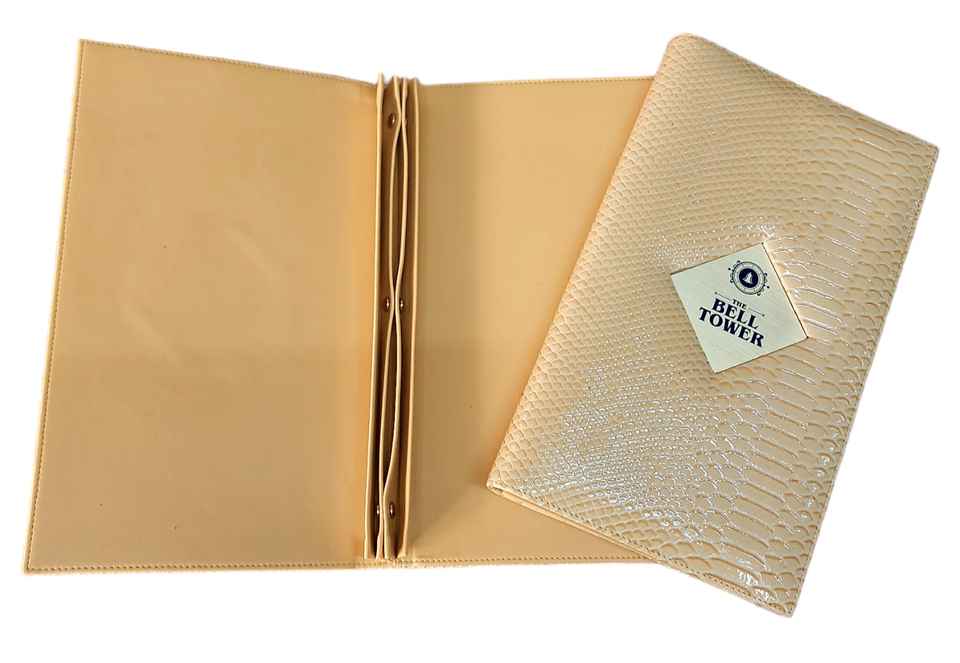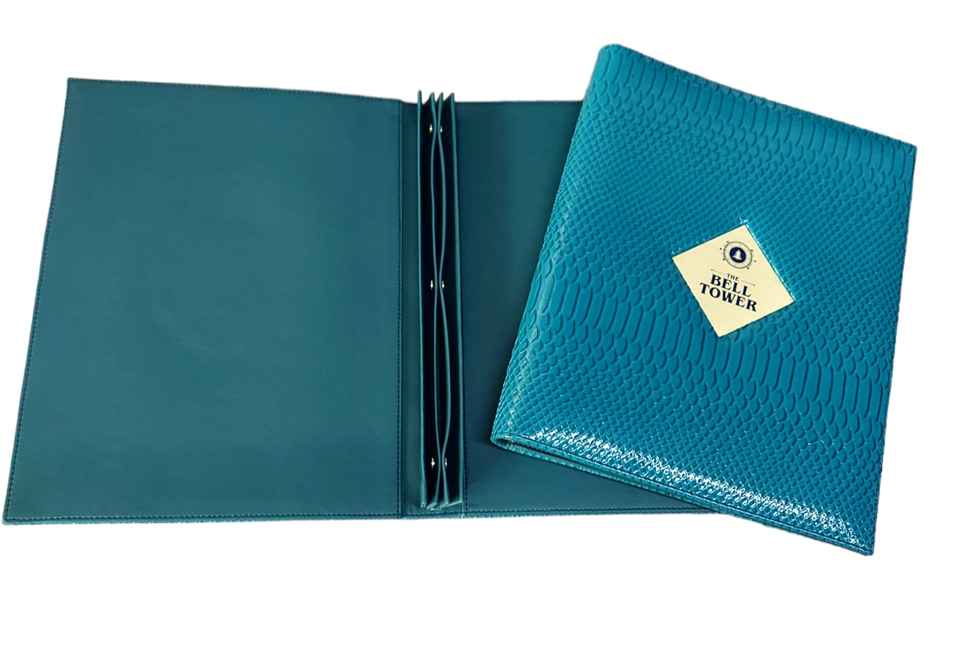 Descripción:Carpeta de menú de cuero sintético con logotipo niquelado