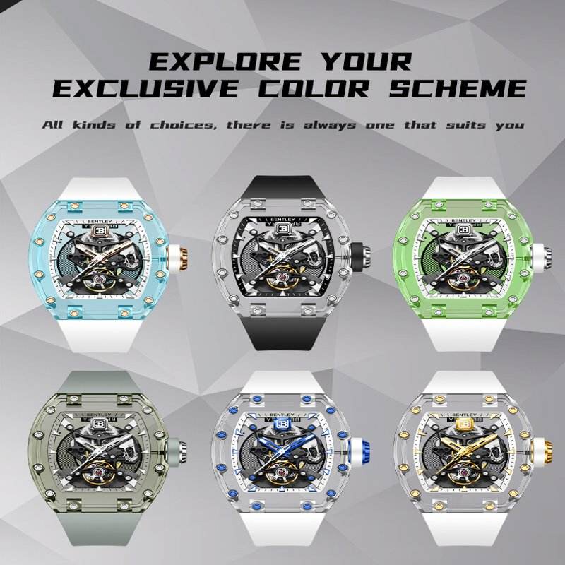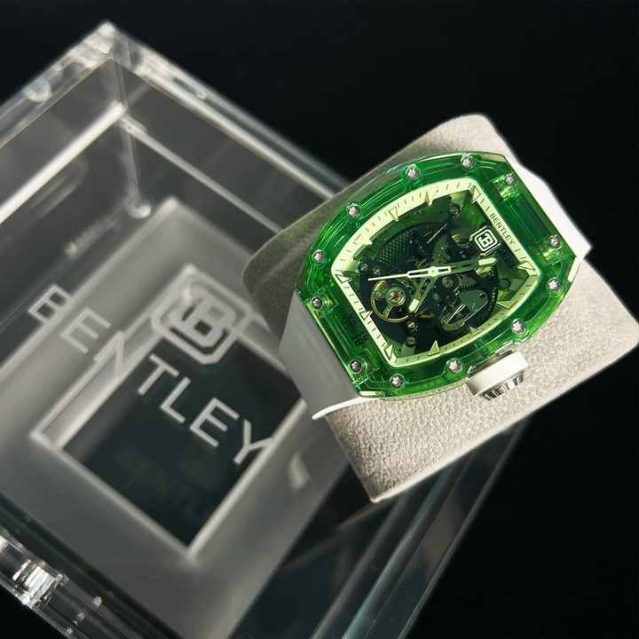 Reloj mecánico Tonneau de estilo piloto verde Jade de alta calidad, movimiento automático, Correa FKM de acero inoxidable, sello impermeable analógico