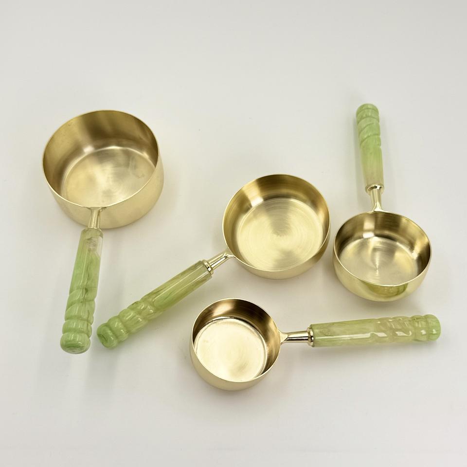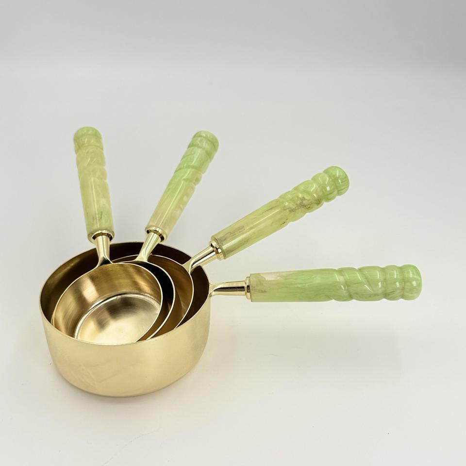Juego de 4 Tazas y Cucharas Medidoras de Acero Inoxidable con Mango de Resina Dorada de Alta Calidad, Aptas para Lavavajillas y Congelador