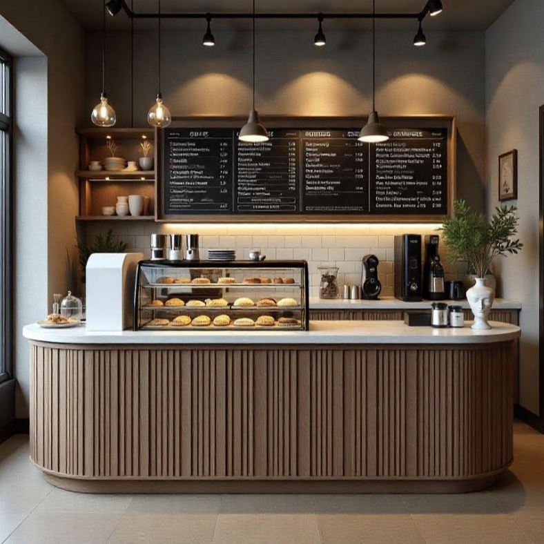 Muebles de Mostrador para Cafetería o Cafetería de Alta Calidad con Iluminación LED, Mármol y Vidrio Templado, con Color Personalizable