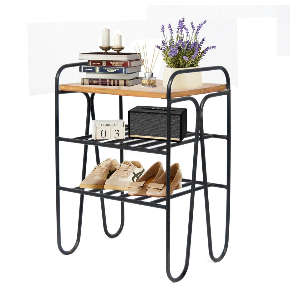 Zapatero con marco de Metal de tamaño personalizado de alta calidad con parte superior de madera, almacenamiento multicapa, gimnasio en casa, soporte para zapatos que ahorra espacio