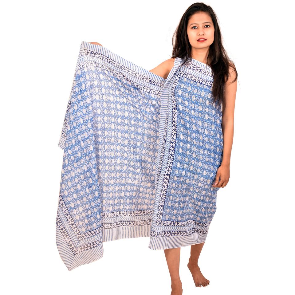 Alta calidad azul claro algodón bloque impreso Sarong hecho a mano invierno bufanda playa cubrir Ups Pareo para mujeres estilo tradicional