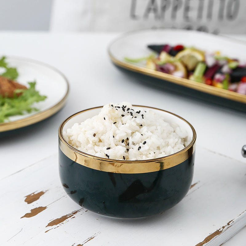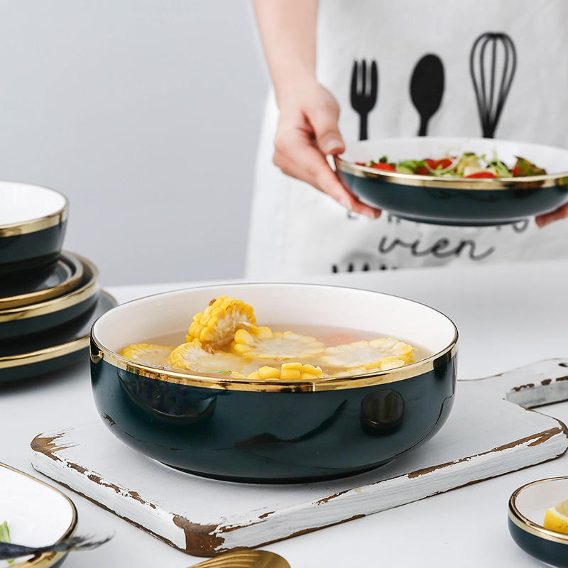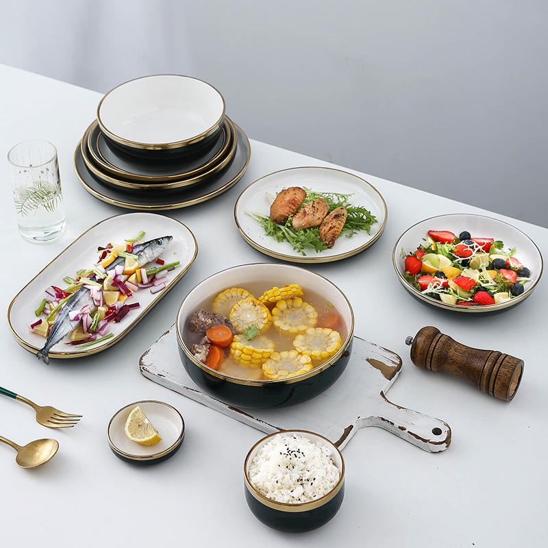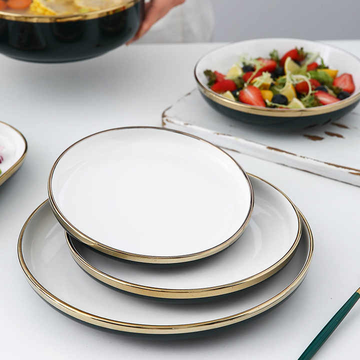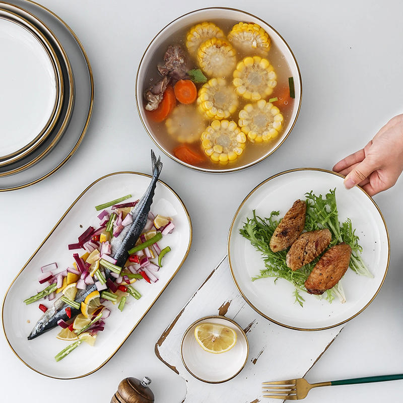 Juego de vajilla de porcelana blanca de lujo, plato de cerámica de alta calidad con borde dorado