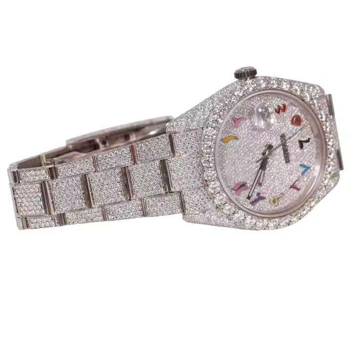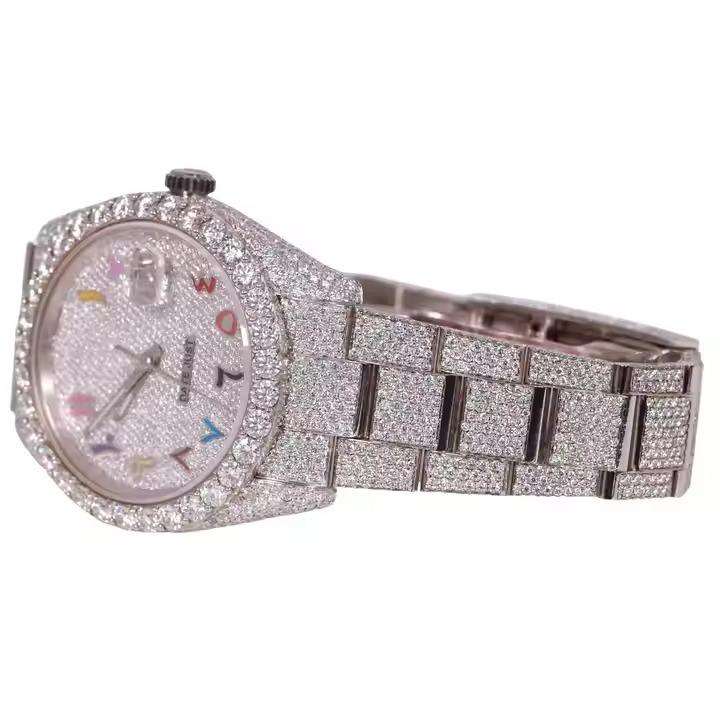 Alta calidad de lujo estilo Hip Hop Acero inoxidable zafiro cristal Moissanite diamante encanto reloj logotipo personalizado Dial analógico