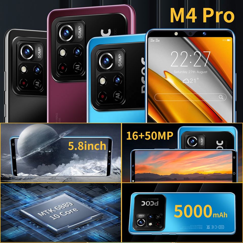 Teléfono Móvil M4 Pro de Alta Calidad, 16 GB + 512 GB, Pantalla Completa de 5.8 Pulgadas, 5000 mAh, Sistema Android 12, Smartphone para Juegos 5G