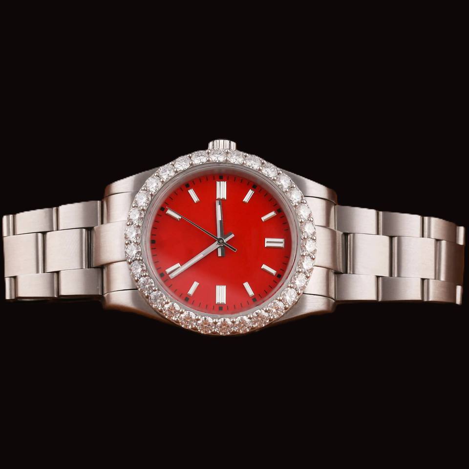 Reloj de Hombre de Alta Calidad, Colección Roja, Esfera Redonda, Bisel con Diamantes Moissanite, Acero Inoxidable, Atractivo Regalo Personalizado para Él