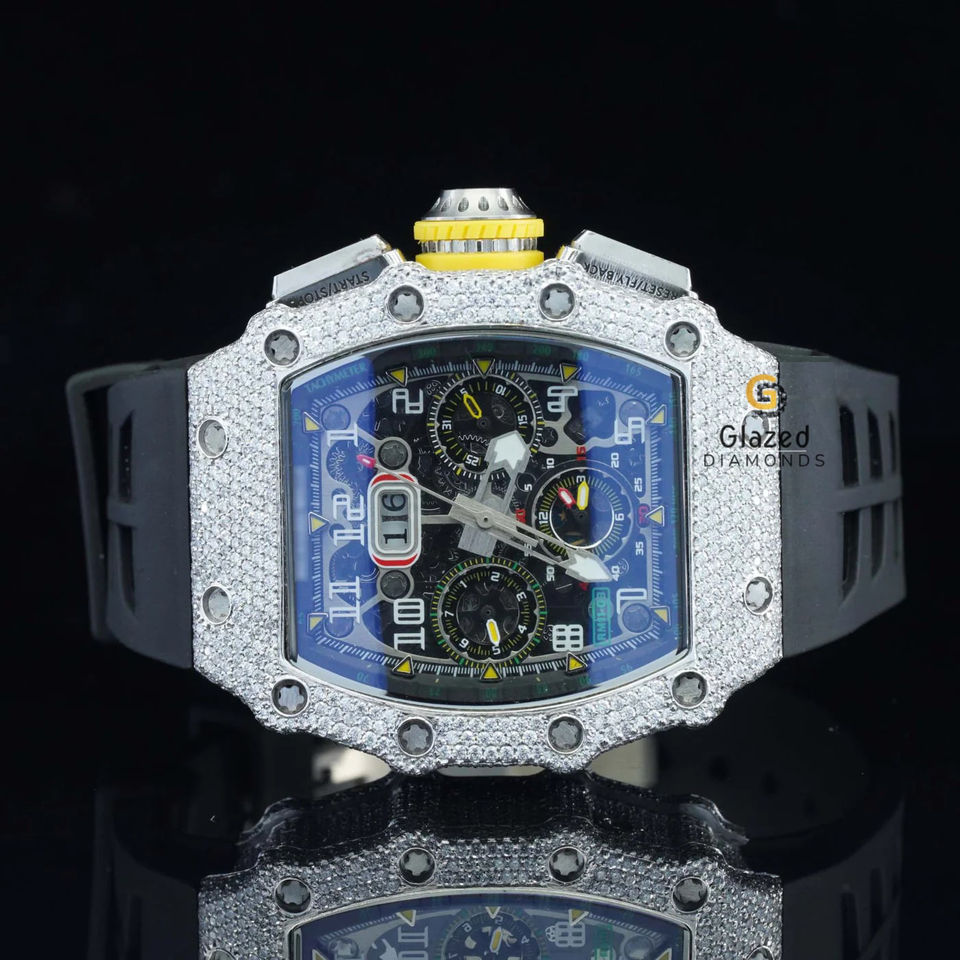 Reloj Moissanite de alta calidad para hombre con diamantes de corte brillante busto completo banda de goma negra esfera analógica pantalla ventana de cristal