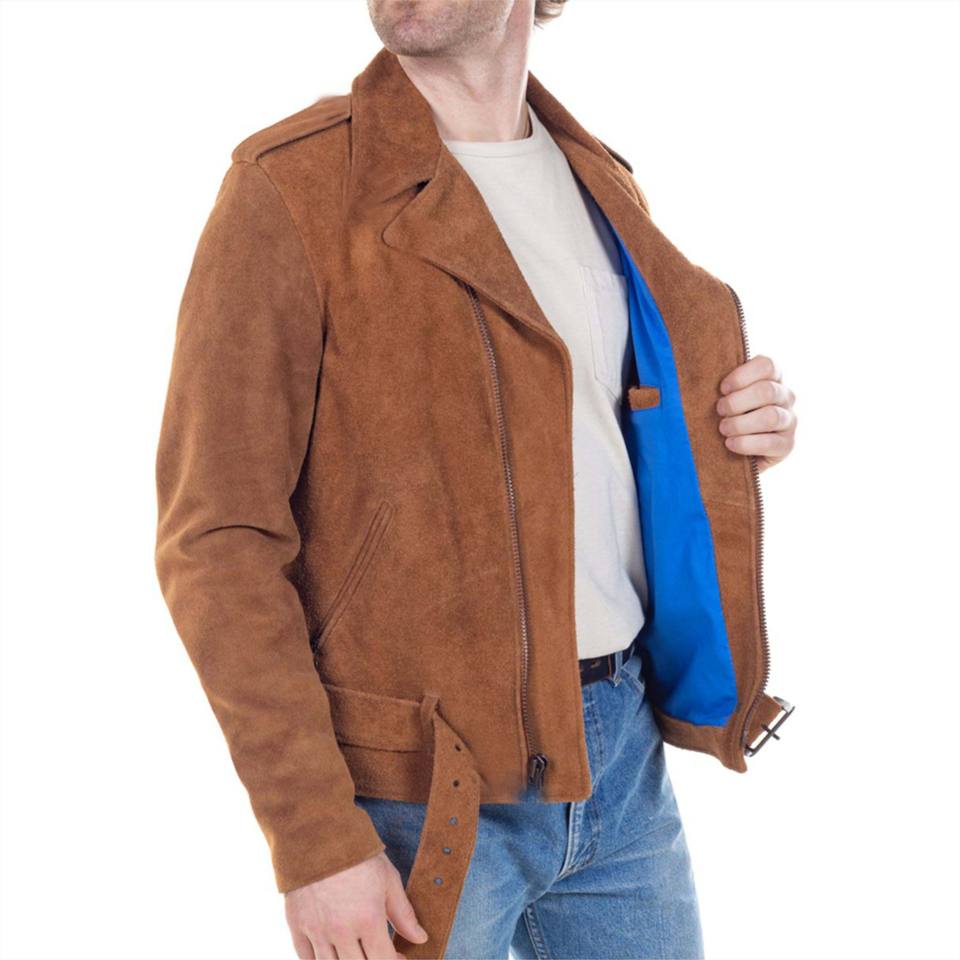 Chaquetas de moto de cuero de gamuza para hombre de alta calidad, venta al por mayor, precio barato, ropa de hombre, chaqueta de cuero de gamuza marrón a la moda para hombre