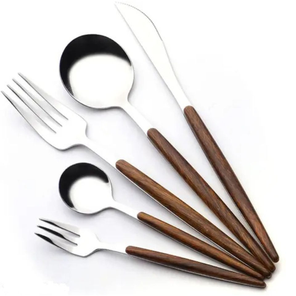 Cubertería de Metal de Alta Calidad, Cuchara y Tenedor de Estilo Vintage, Cubiertos de Acero Inoxidable con Mango de Imitación Madera para Uso en Restaurantes