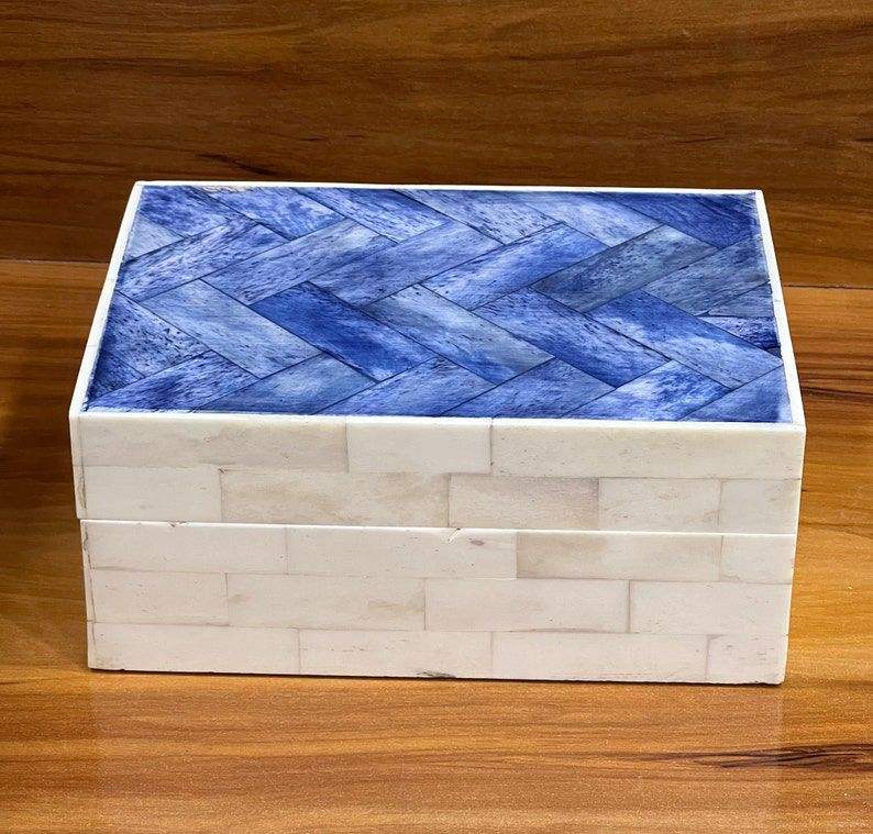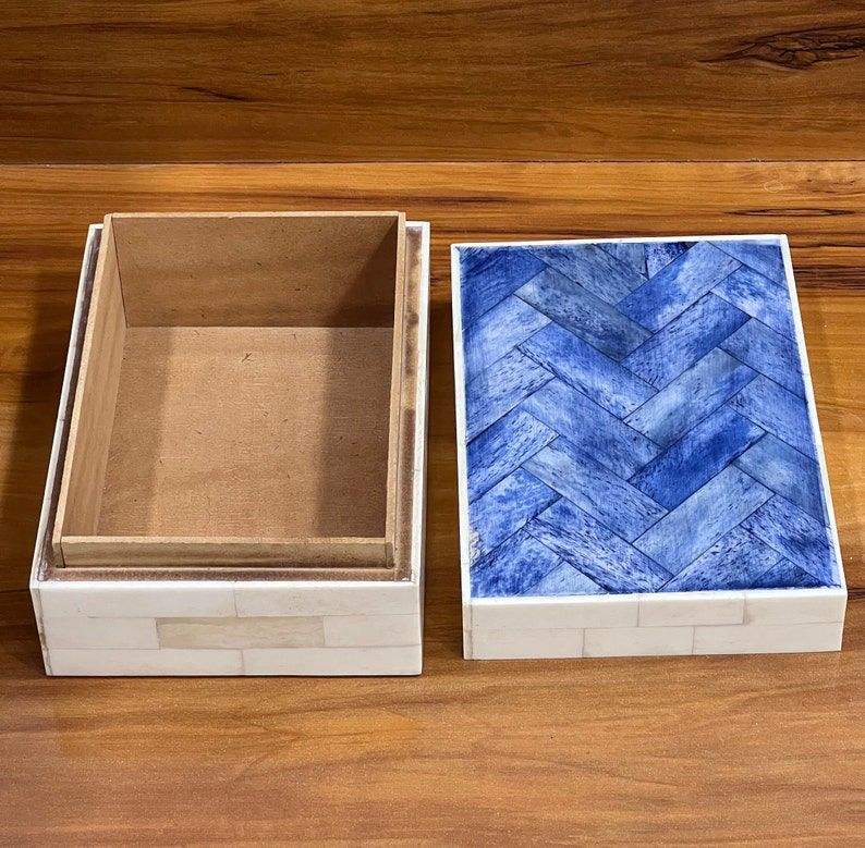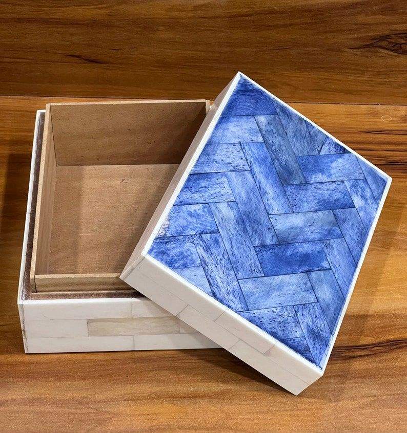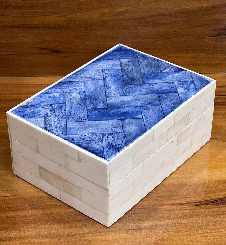 Caja de almacenamiento con incrustaciones de hueso moderna de alta calidad, organizador de joyas de madera blanca y azul, patrón cuadrado, uso de regalo multiusos, artesanías HF