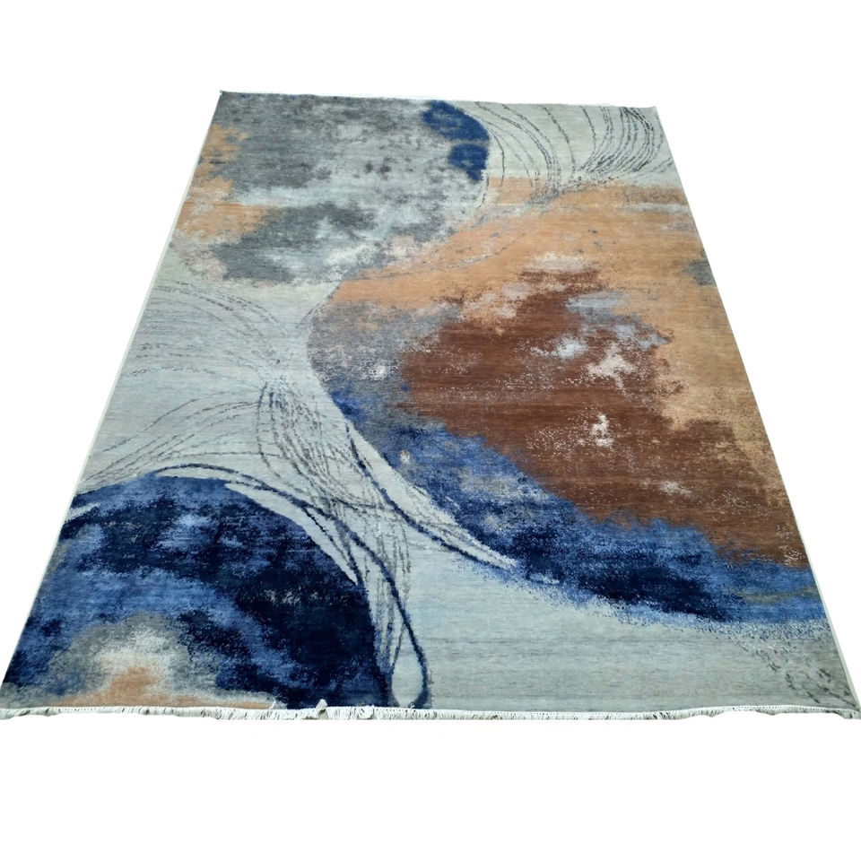 Alfombra moderna de alta calidad anudada a mano de lana/seda de bambú con altura de pila de 8-10mm en patrón azul y naranja