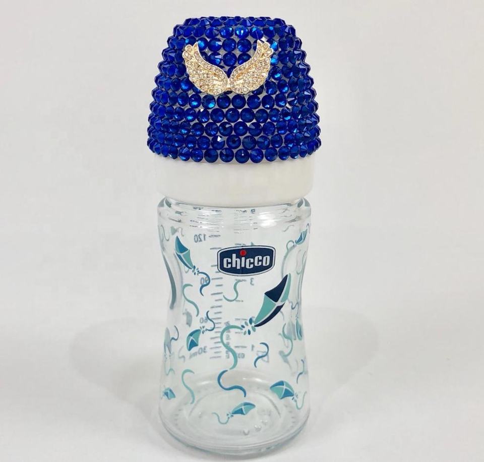 Biberón de Vidrio Azul para Bebé, Diseño Moderno, Alta Calidad, Personalizado, Venta al por Mayor, Libre de BPA, con Asa, Forma de Corazón y Mariposa