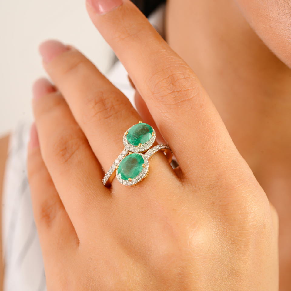 Esmeralda Natural de alta calidad y Diamante Real 14K oro amarillo declaración Bypass anillo Unisex boda joyería al por mayor