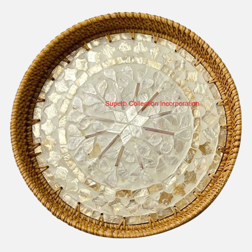 Bandeja de servicio de ratán Natural de alta calidad con incrustaciones de mosaico de concha elegante bandeja decorativa Rectangular para uso en cocina y comedor