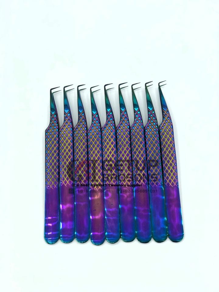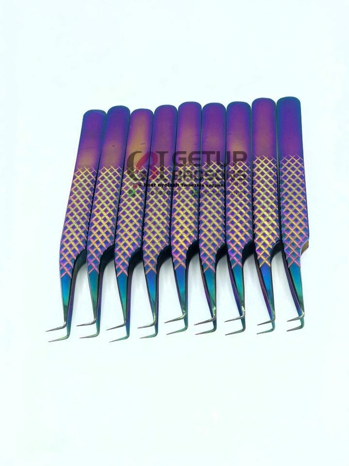Alta calidad nuevo 90 grados Arco Iris Plasma diamante agarre Acero inoxidable extensión de pestañas pinzas logotipo personalizado herramienta de belleza