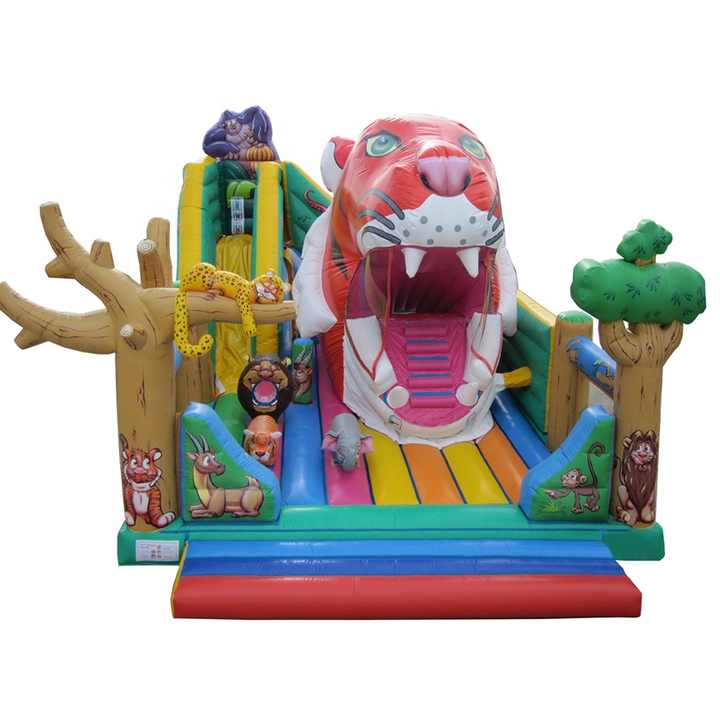 Funland de animales de la jungla de PVC de alta calidad con boca de tigre móvil y toboganes de escalada de salto obstáculos para niños