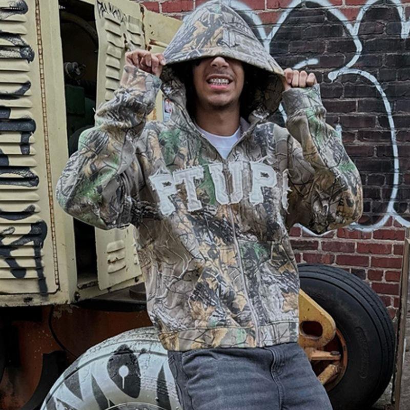 Parche de alta calidad Patchwork cremallera pulóver peso pesado árbol Real camuflaje sudaderas con capucha logotipo personalizado bordado Zip up Sudadera con capucha hombres