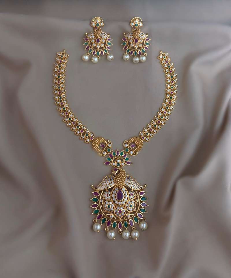 Conjunto de collar simple de diseño de pavo real de alta calidad para mujer Zirconia cúbica con acabado mate para bodas y fiestas hechas de latón