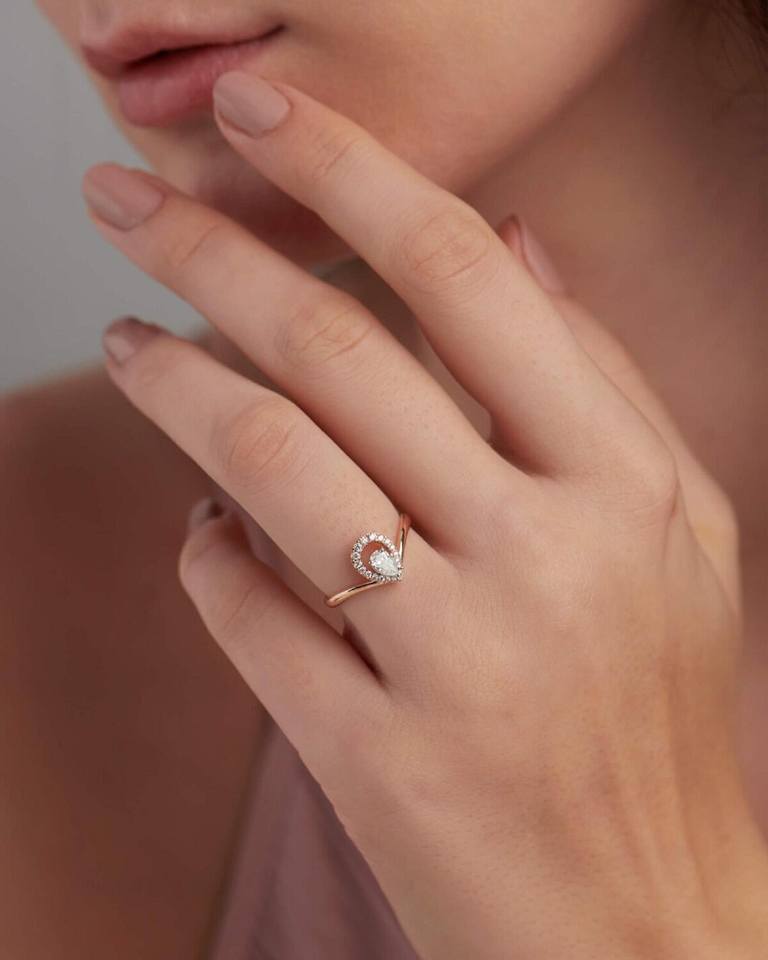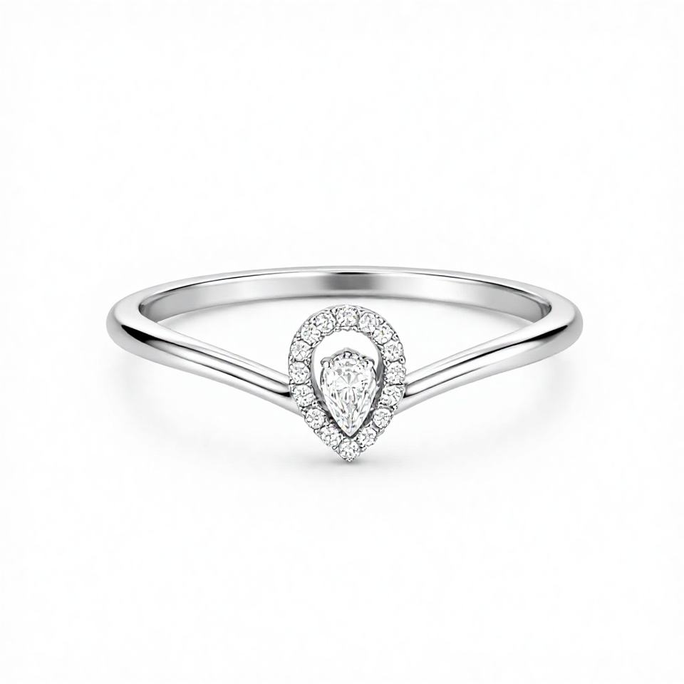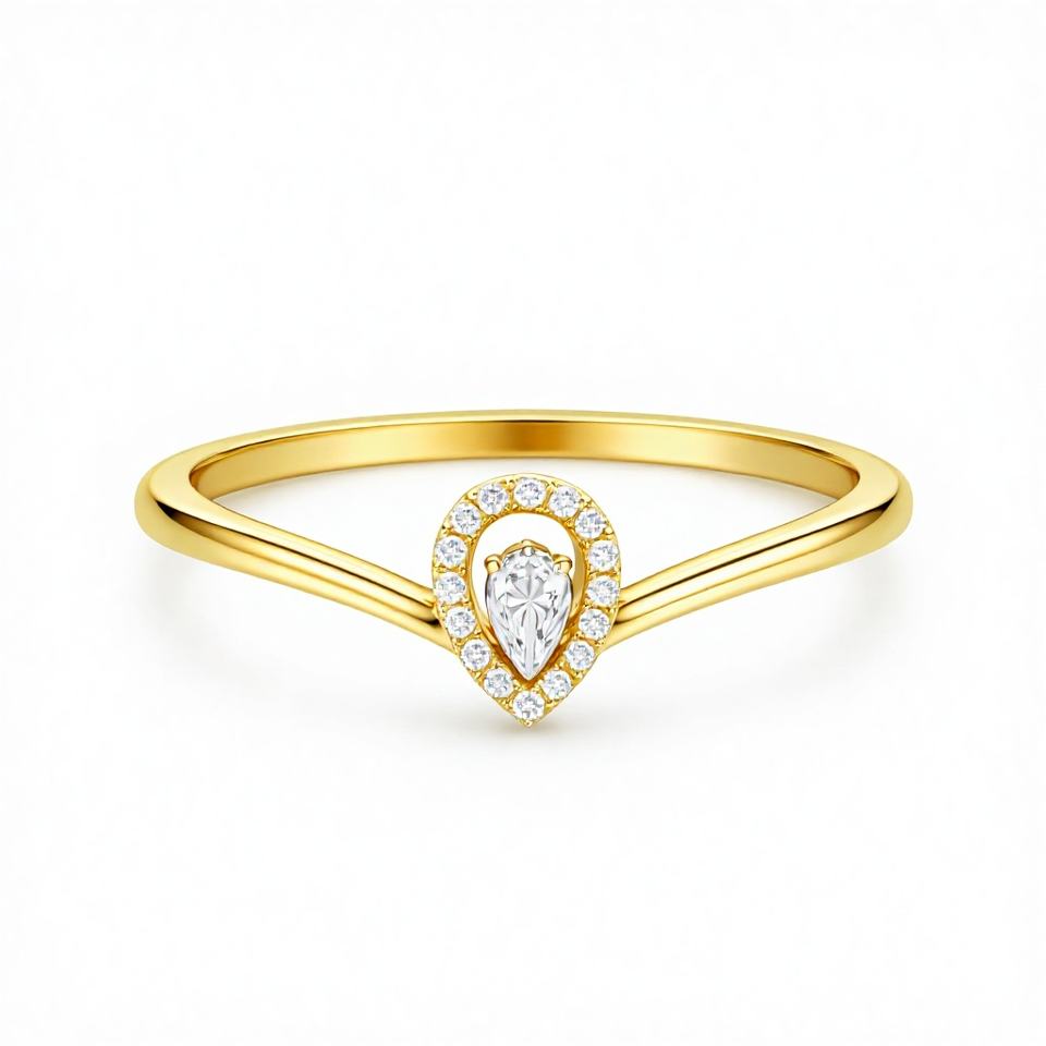Nombre del producto:Anillo de Boda Curvo Chevron con Halo de Oro de 18K, Corte Pera en Forma de Lágrima