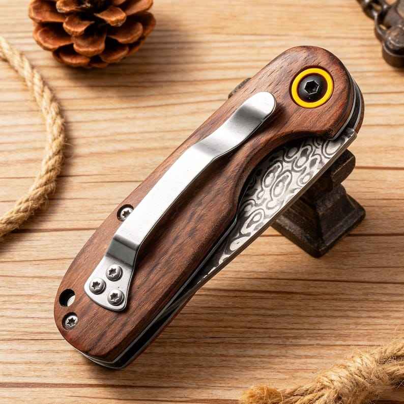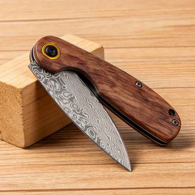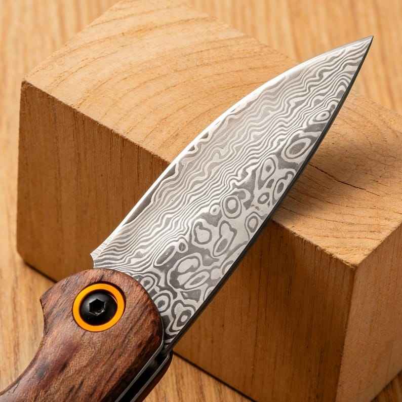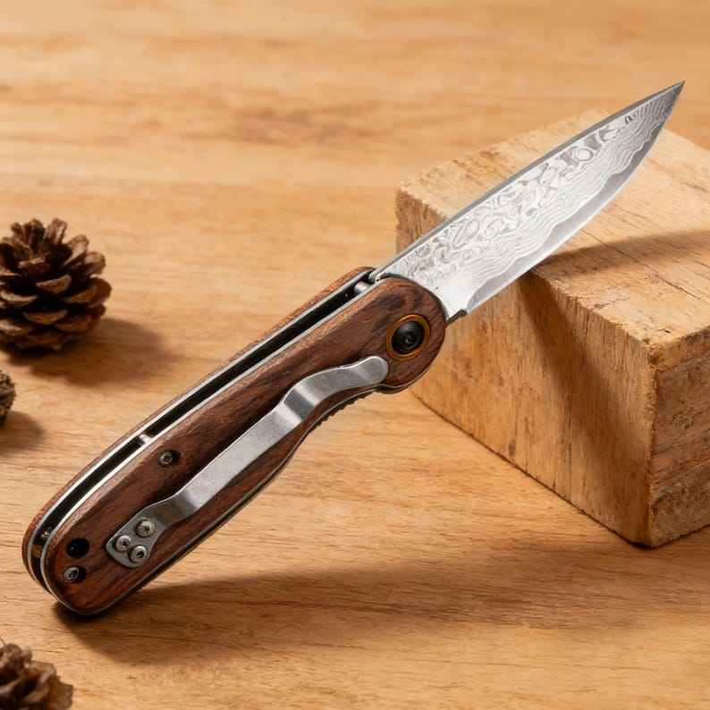 Cuchillo Plegable de Caza Hecho a Mano de Alta Calidad y Durabilidad, Personalizado, de Acero de Damasco, con Mango de Madera Personalizado